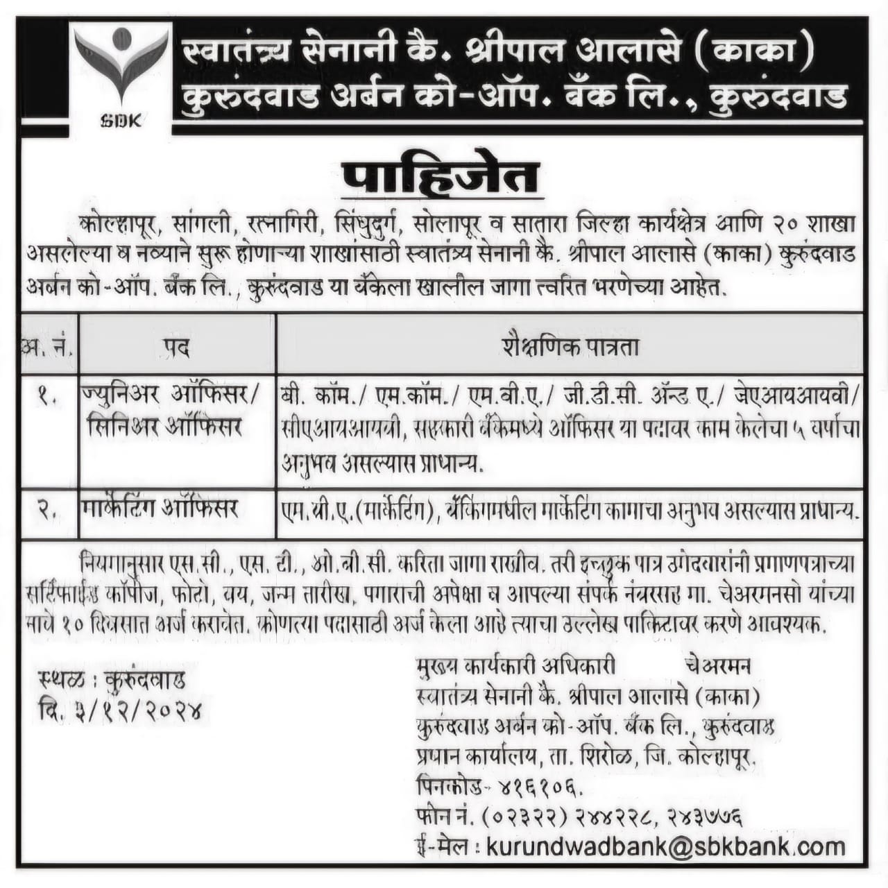 Swatantrya Senani Late. Shripal Alase(Kaka) Kurundwad Urban Co-Operative Bank Ltd., Kurundwad
